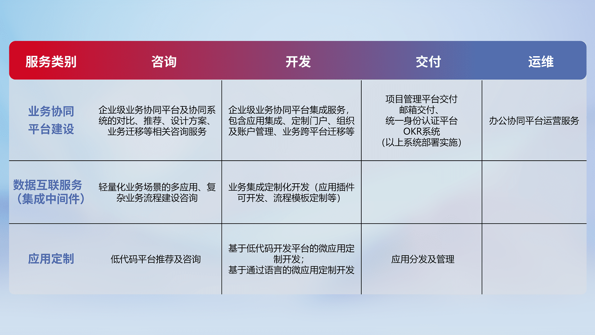 针对钉钉、、、企微、、、、IDaas等平台级产品提供产品的规划、、、方案、、、交付、、、、定制化开发等服务,,实现如统一协同办公、、、智能客户服务、、、混合会议管理、、、、智能数据查询、、等业务场景,,,,实现数字化转型。。
